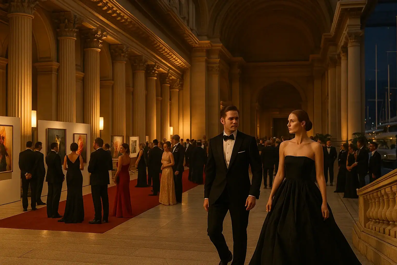 Exclusive luxury gala with guests in formal attire inside a grand hall with art displays and yacht views.
