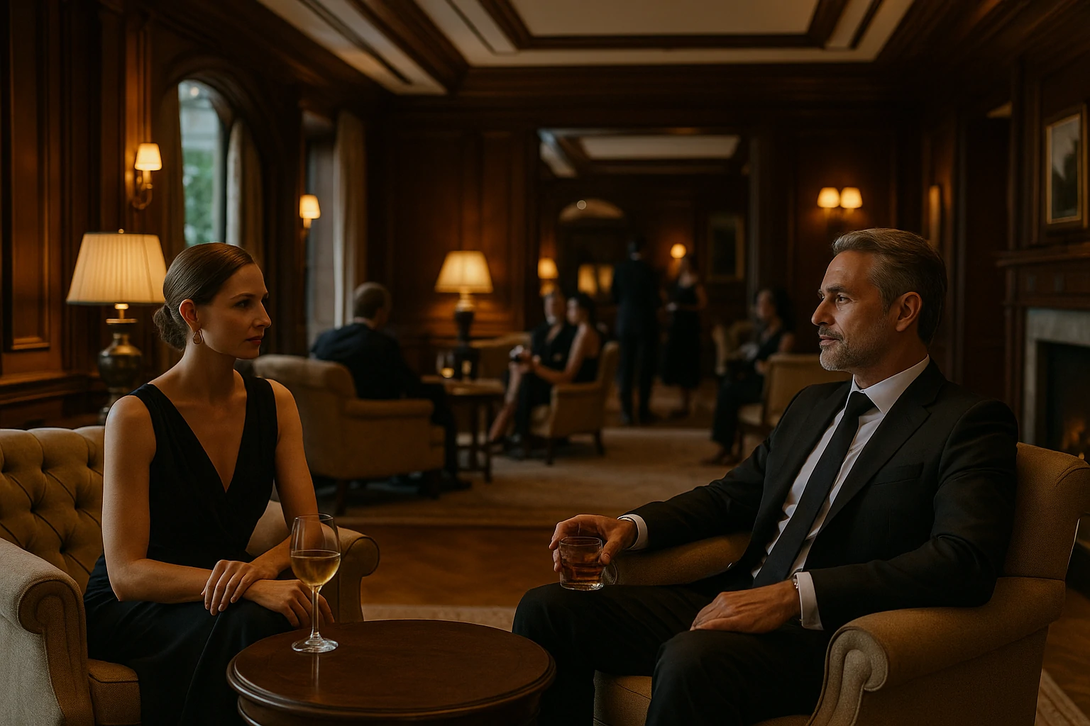 A quiet luxury lounge where wealthy guests enjoy privacy and calm.