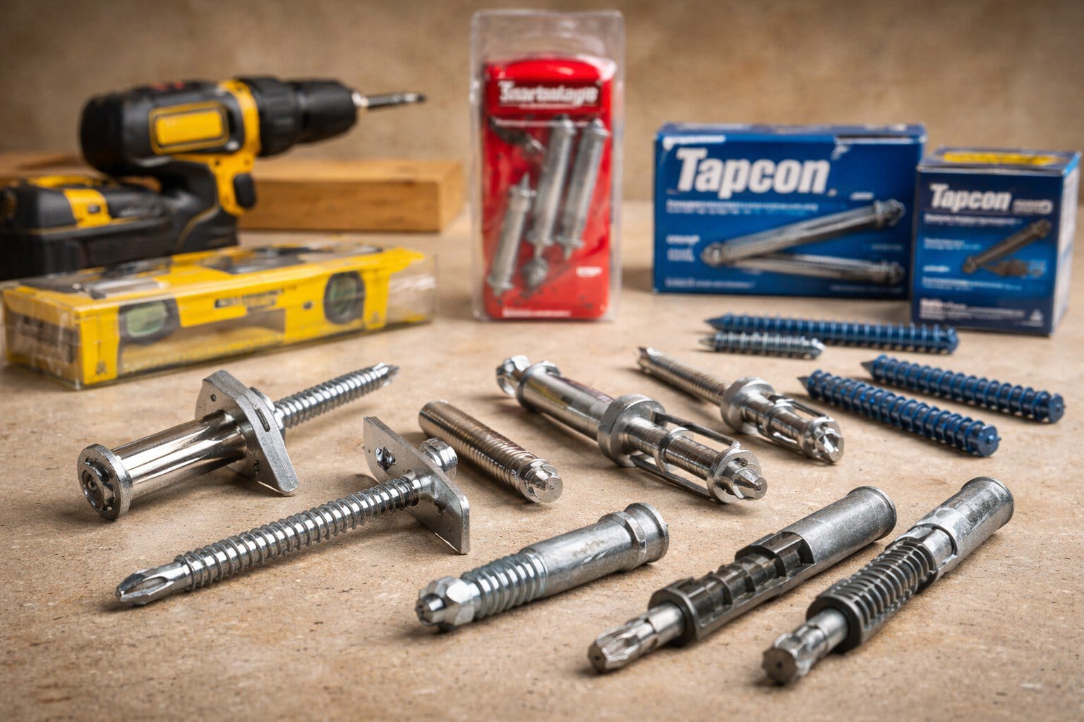 - Concrete screws: Needed for brick or cement walls. Tapcon is a trusted brand.