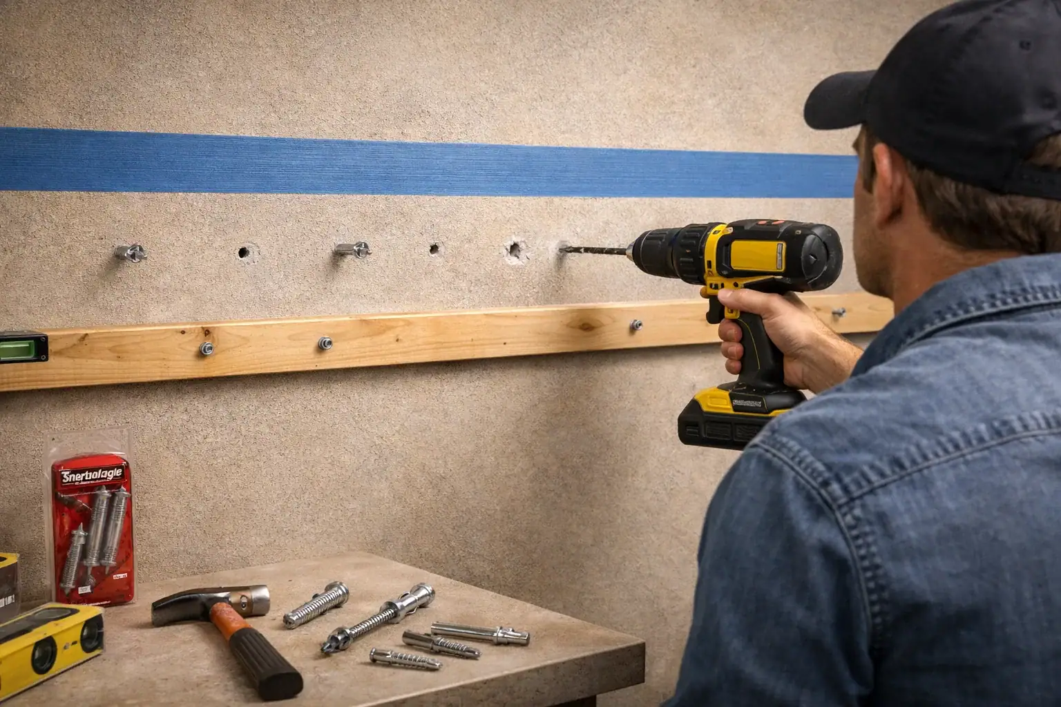 Drill with a hammer drill and masonry bit. Always pre-drill holes. Use anchors rated for 150–300 pounds. This works well in basements, garages, or older homes with thick walls.