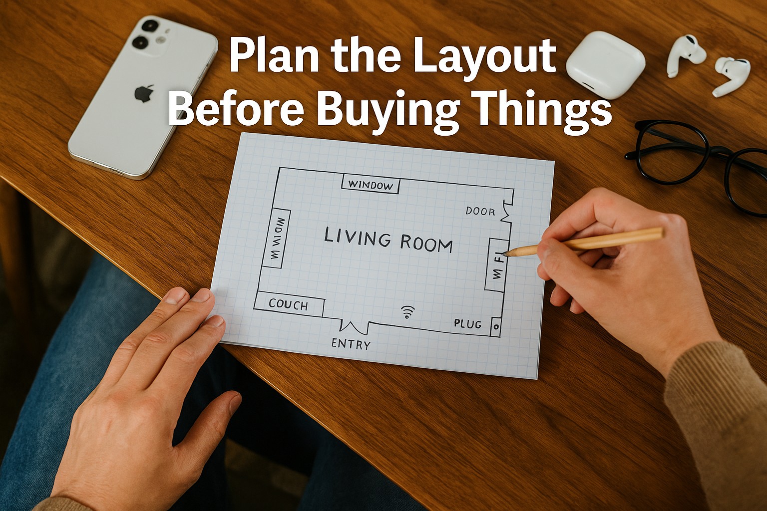 A smart décor and tech setup starts on paper. Not in the store. Draw your room. Note doors, windows, plugs, Wi-Fi spot, TV wall, and entry. This shows how the room breathes. You will see where to place large items.
