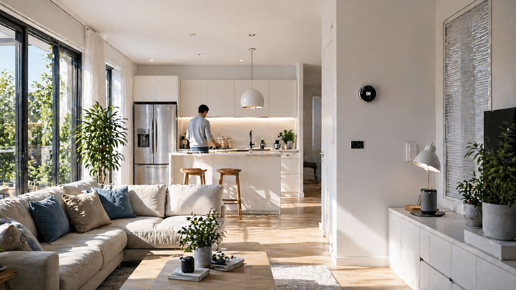 energy efficient home interior with natural sunlight smart thermostat and modern appliances